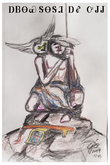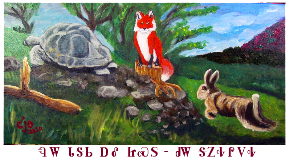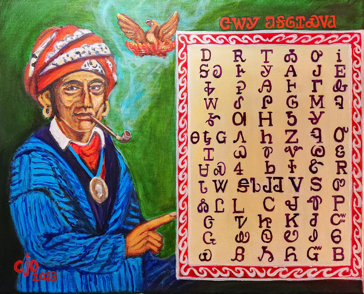 Lately, I’ve been having fun with learning by labeling several of my artworks with Cherokee words & phrases, to the best of my ability. (I’d guess i’m currently about at a Kindergarten level of literacy.) I’m sharing some of those here now, with translations & pronunciations in the captions.
