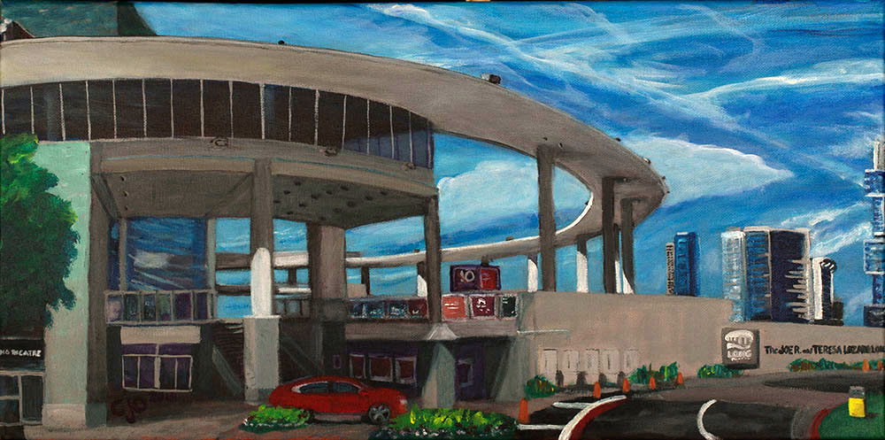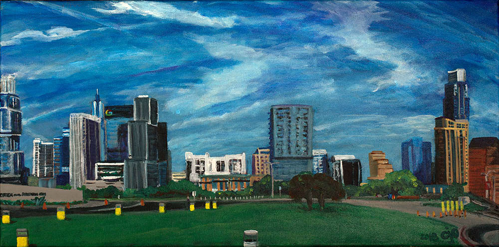 In Autumn of 2018, soon after the floods in Austin, the rain cleared and it was a Sunday afternoon when my wife & I went to the Long Center to see a matinee of the Tapestry Dance Company, America’s only professional Tap Dance company, based right here in Austin. We love their shows, and have been to many, and help them out as volunteers etc. Anyway, when we walked out of the theater, this acrylic painting pretty much represents our view of our city, which we love.