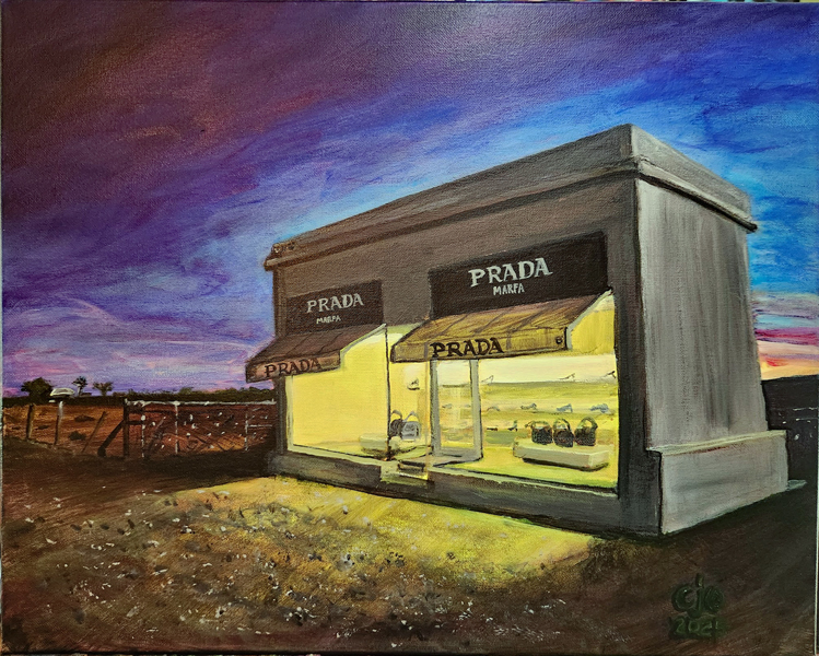 One of my favorite subject series, I have made and sold many paintings of Prada Marfa, the famous art installation in far west Texas; scenes at different times of day and night and from different angles. This is my most recent Prada Marfa painting to date; inspired by a photo made by my wife on a recent trip to her sister’s family home.