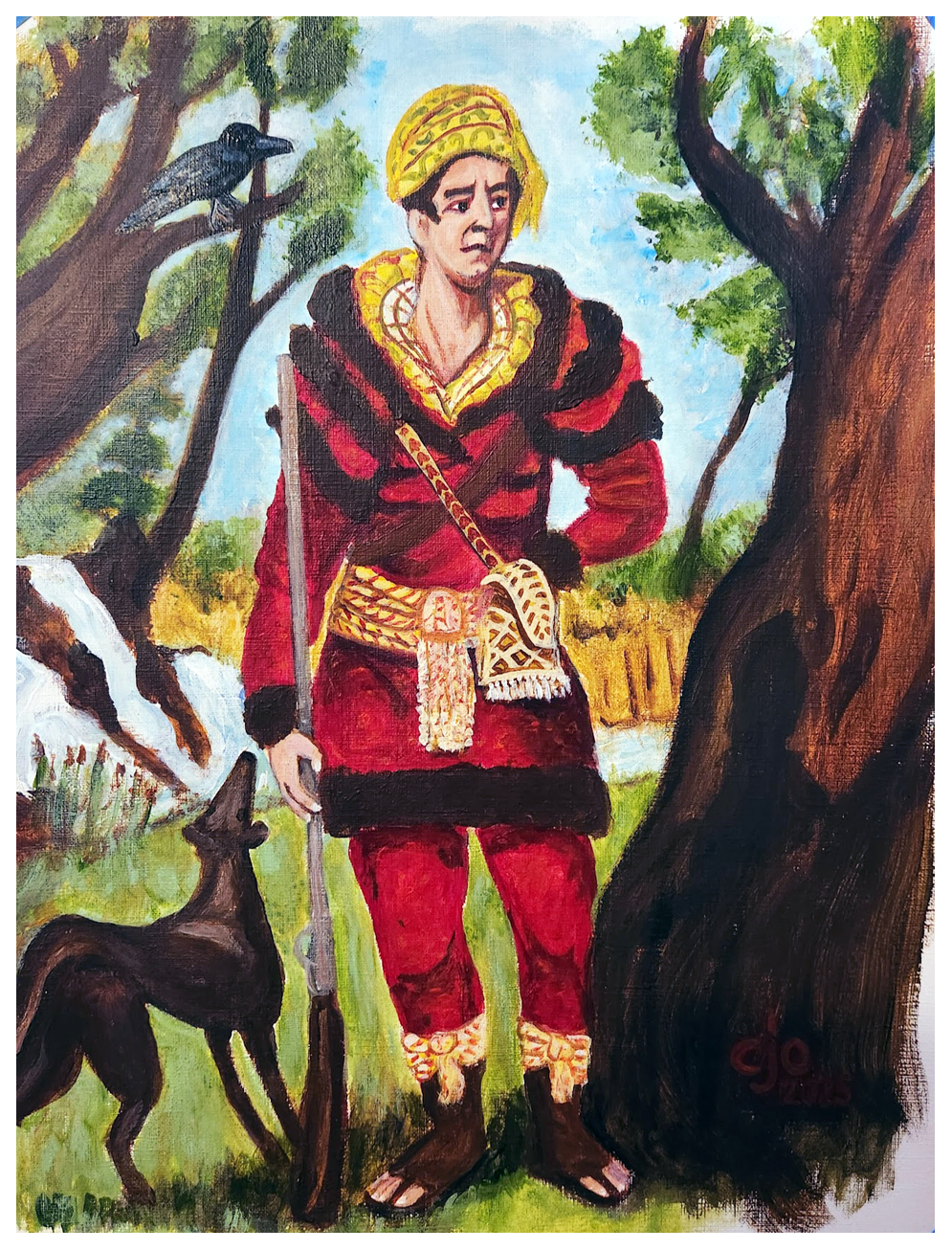 Original painting by Christopher J.. Oglesby inspired by several historic black and white lithographs and paintings of young Sam Houston and other Cherokee grandees in Cherokee garb; the raven added as artistic flair.
